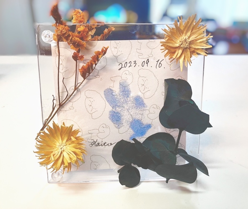 カイト君の足形をとったあとは、透明のフレームに入れてドライフラワーで飾ってみました。他にも自分の手帳に押したり、足形を切り取ってキーホルダーにしたり…とアイデア次第でいろいろな作品作りができそうでワクワクしちゃいます。