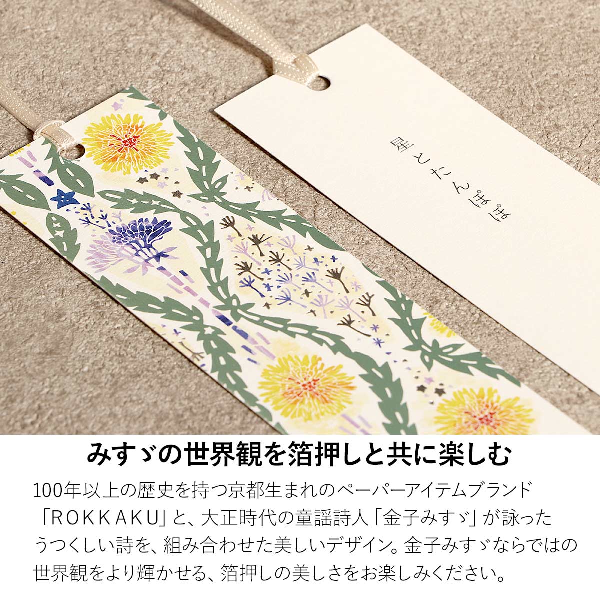 最初にご紹介するのは「ROKKAKU(ロッカク)×misuzu uta(みすゞ詩)」の「箔押し栞」。大正時代に活躍した童謡詩人『金子みすゞ』の代表作を栞にしたアイテムです。