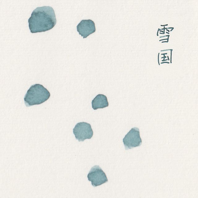 「トンネルを抜けると雪国であった」という一説が有名ですが、言葉をみるだけで色のない真っ白な景色がパッと浮かんできますよね。色のない雪の世界だからこそ感じられる、登場人物のもつれあう感情が鮮明に描かれたこの物語は、今も愛される名著の一つ。その静かな雪国での物語をインクの色で表現しました。