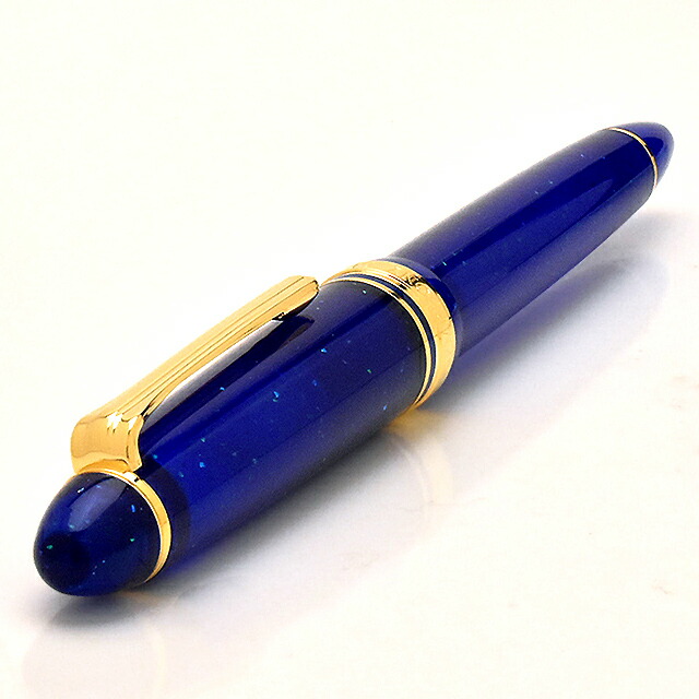 深いロイヤルブルーのボディに淡いグリーンとブルーのラメが散りばめられ、銀河を駆ける鉄道の轍をイメージしたこちらの万年筆。ゴールドパーツがポイントになっていて印象的ですね。この万年筆で物語の世界観を感じながら、自分にとっての「ほんとうのさいわい」を綴ってみたくなります。