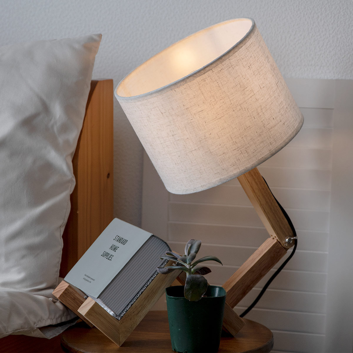 足と首部分の角度を調整することで、作業デスクの上に腰かけているように見せられます。ウッド素材をベースに作られているから、北欧家具をはじめとしたさまざまなデザインのインテリアとの相性もぴったり。