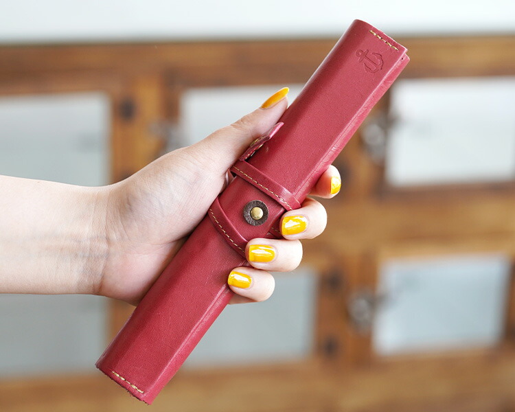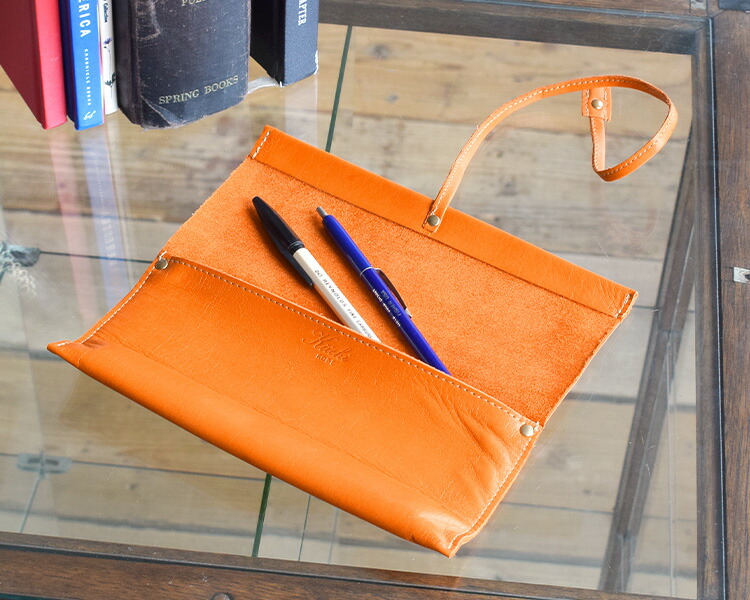 ケースの内側はあえて別の生地を使用しておらず、シワ・細かな傷といった栃木レザーならではの自然な表情を楽しめるのもポイント。薄い作りですがとても丈夫で、太めのボールペンもすっぽり入るほどのサイズ感です。