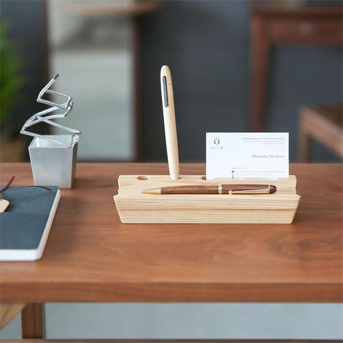 ペン皿のカーブは、真ん中の溝に向かってわずかに深いU字になっています。単調になりがちな木製品の、アクセントになっているんです。ペン立ての部分に彫られた横の溝は、カードスタンドになっています。メモや名刺をサッと挟めるのはうれしいですね。