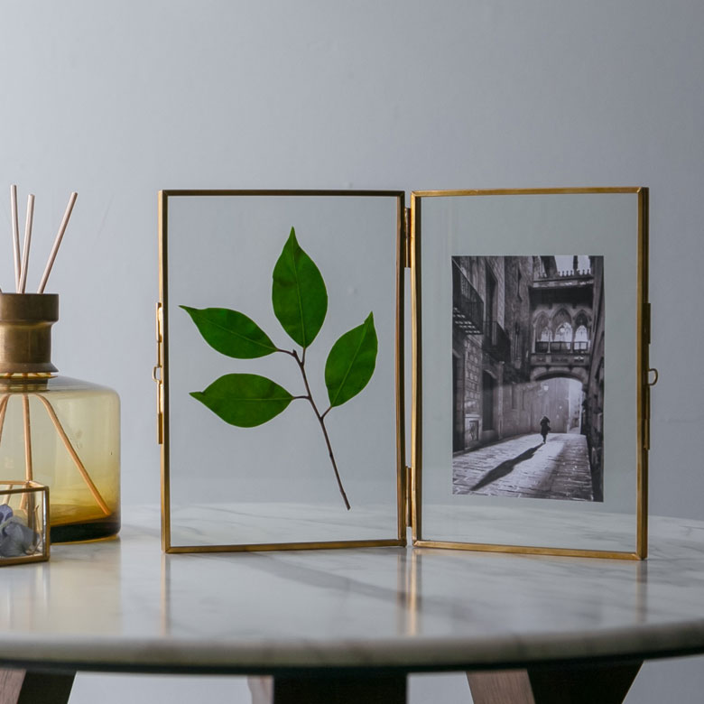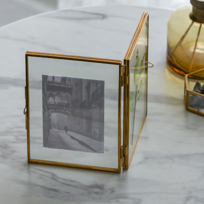 こちらは、細身の真鍮と透明感が美しいガラスのフォトフレームです。シンプルな2面のフォトフレームは、サイドのロックを外して写真や絵を挟むタイプ。ポストカードのサイズまで対応しています。2面の開き具合で立ち姿が変わり、いろいろな表情を見せてくれます。