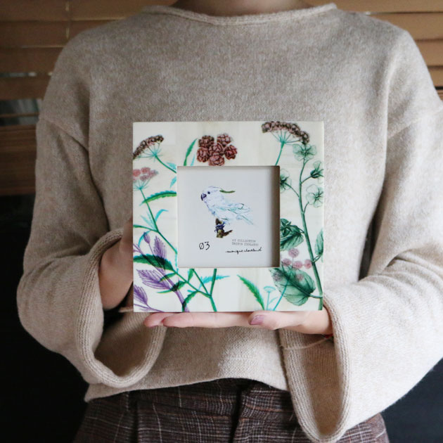 とても小さいサイズなので、チェキなどを入れて飾るのにおすすめです。ちなみに、始めからフォトフレームに入っている小鳥のイラストはモニークチャートランドのデザイナーが描いた水彩画。そのままオブジェにしてもインテリアのアクセントになりますよ。