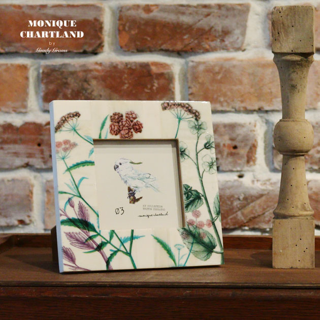 こちらは「MONIQUE CHARTLAND(モニークチャートランド)」の「RAISEN」というフォトフレームです。白のフレームに鮮やかな花や植物が描かれているのが印象的。背面にはスタンドとDリングが付いているので、卓上に置いたり壁に飾ったりできます。