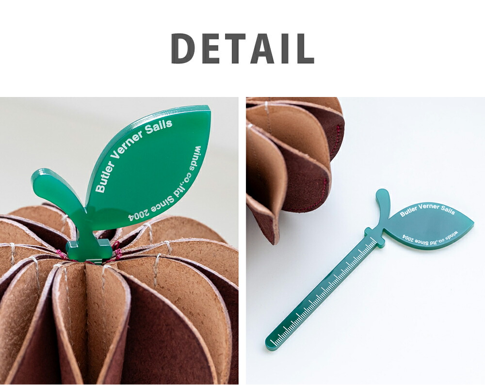 そして、中央に見える葉っぱはなんとアクリル製の定規。実用性とユニークなデザインを兼ね備えた、遊び心の溢れるアイテムです。さらに、素材は手間のかかるなめし行程を経た上質な「栃木レザー」という本格派。奥深い色合いと表情豊かな経年変化を楽しめます。