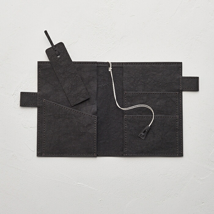 2辺が開いた大きなポケットと、カードポケットが2つ、形の異なる栞が2つ付いていて、同時利用する文具の収納にも困りません。