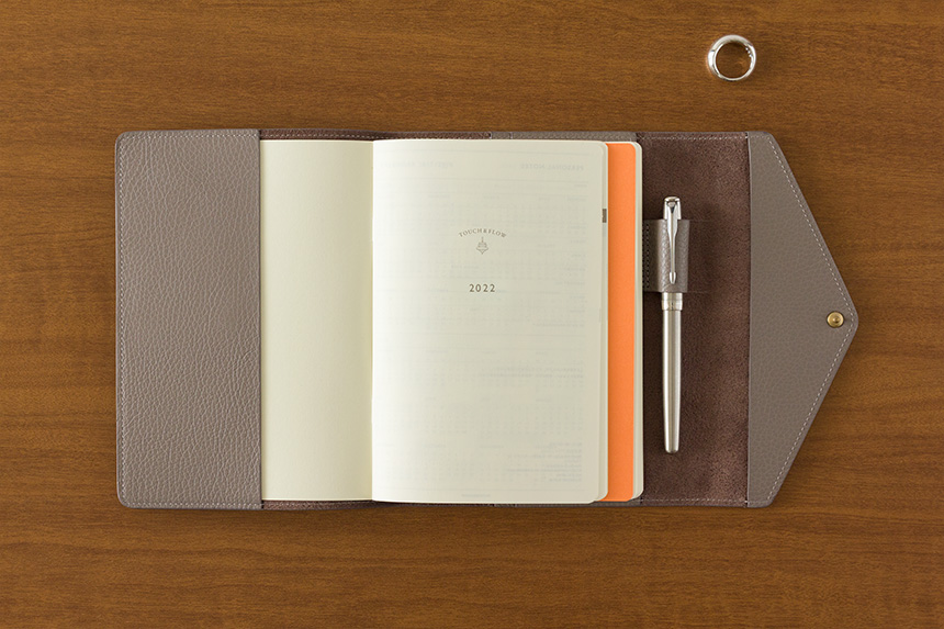 こちらは、革の上品な光沢が美しい「TOUCH&FLOW(タッチアンドフロー)」のノートカバーです。上質なイタリア製のシュリンクレザーを使用しており、しっとりとした質感でよく手に馴染みます。何気なく机の上に置いても絵になり、ワンランク上の良質なノートカバーを探している方におすすめです。