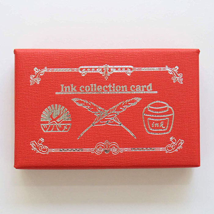 インクカードの用紙には、水性インクと相性がいいとされるツバメノートのツバメ中性フールス紙を使用しています。また、名刺サイズのカードなので、ファイルに綴じて持ち運ぶことも可能。さらに、銀箔のプリントが施されたインクカードの箱もレトロで心惹かれるポイントです。《インク沼》では、インクカードが素敵なパートナーとなってくれますよ。