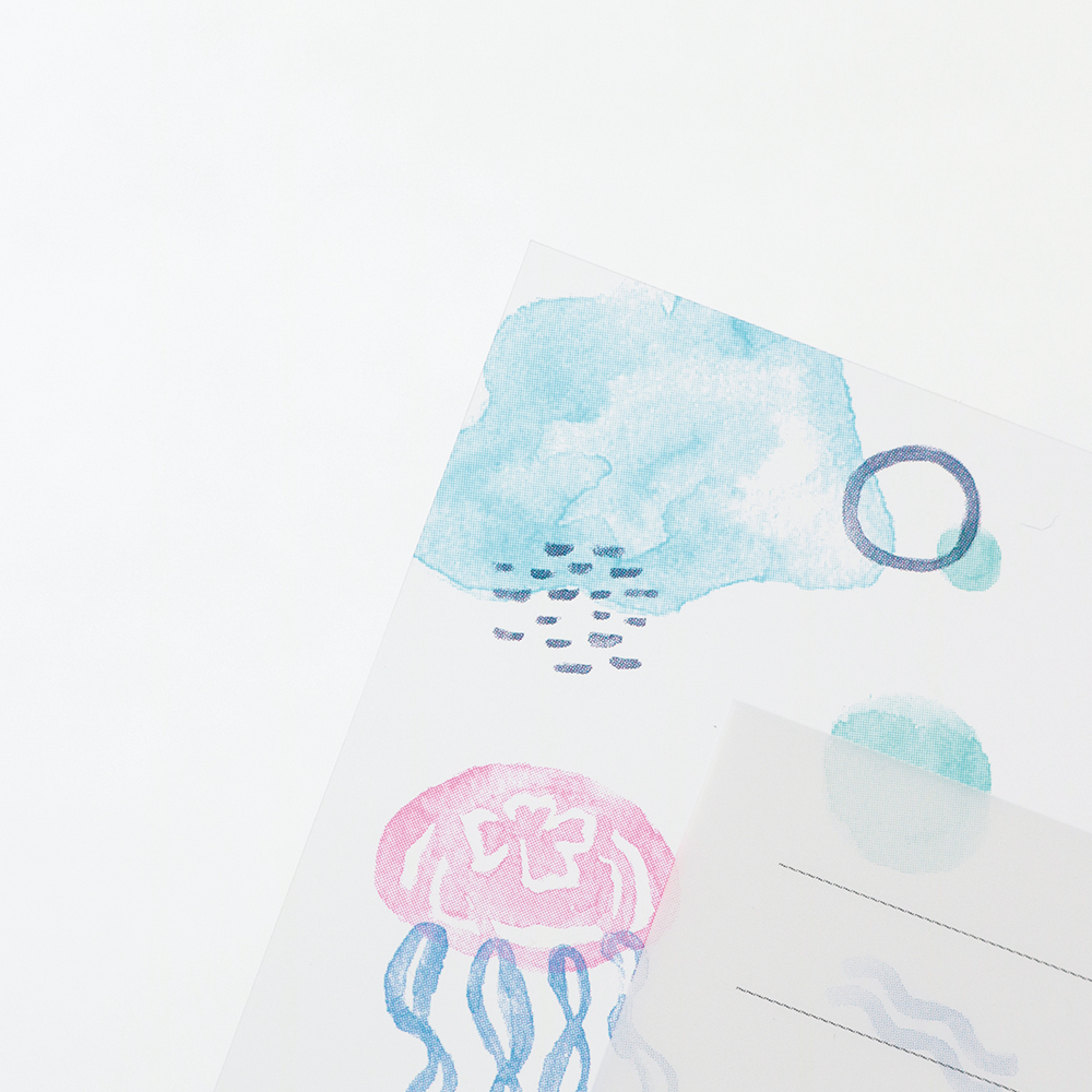続いては、透明感のある素材を使用した「GreenFlash」の「KOHAKU」シリーズからクラゲ柄のレターセットをご紹介。便箋はクリア素材、封筒はトレーシングペーパーで作られていて、涼しげで儚い印象が魅力的です。