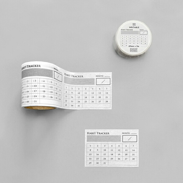 「KNOOPWORKS」の「HABITマスキングテープ」は、日々のタスク・習慣を管理できるようにデザインされた機能的なおしゃれ文具です。テープ上部には習慣化したいタスクの内容が書けるスペース、そしてマス目には1か月分の日付にあたる1~31の数字がプリントされているのが特徴。
